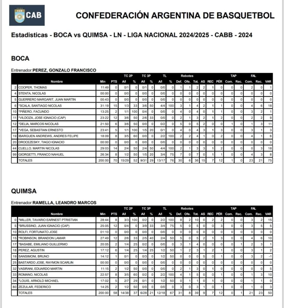 Cuello junto a Ibargüen con un parcial de siete a cero acomodaban de nuevo al campeón defensor de La Liga, los dirigidos por coach Ramella no tardaron en contestar con Pérez Tapia pero luego fallaron tres ofensivas y Boca no perdonó con Ibargüen para una luz de ocho puntos con 5’49» en el reloj. Luego de un pasaje errático en ambos canastos, el Xeneize amplió con libres y un triple de Scala para manejar el cierre apoyándose en el tiempo que se consumía. Triunfo de Boca ante Quimsa por 70 a 58.